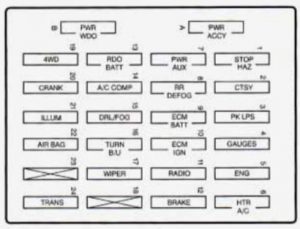 | 4 | Alternator Field, A/C Compressor Relay, Cluster Chime Module, DRL Relay Coil, Four-Wheel-Drive Indicator Lamp, DRL Module, Transfer Case Control Module Ignition, SIR Redundant Ignition, RKE Ignition |