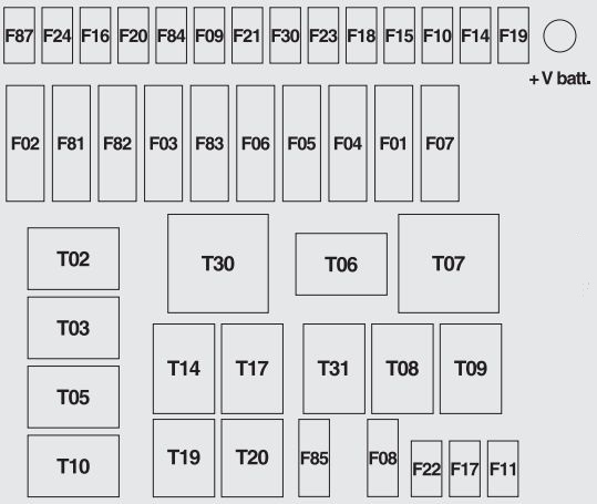 | +15 for backing lights, T02, T05, T14 and T19 relay coils | F87 | 7,5 |