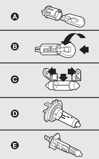 B – Bayonet type bulbs: to remove this type of bulb from its holder, press the bulb and turn it anticlockwise