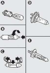 D – E – Halogen bulbs To remove, free it from the clip on its housing