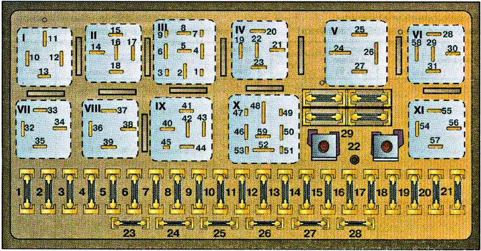 | VI | up to 1990: A/C fresh air blower, J11 from 1990: Radiator cooling fan high speed relay, J101 |