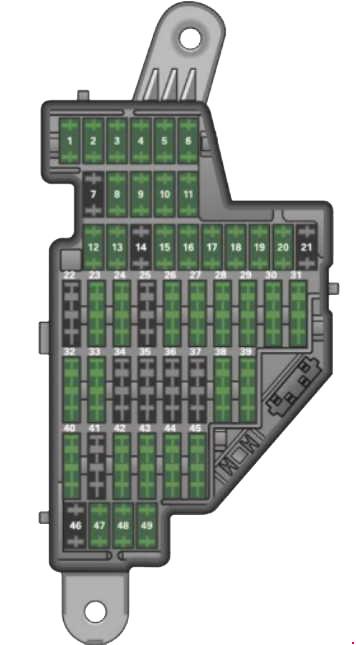 | 1 | 10 | Engine relay, fuel tank control unit, Airbag Off light, light switch (switch illumination), diagnostic connector |