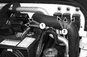 The excavator has a 12 volt, negative ground electrical system. The electrical system is controlled by fuses and relays located in the right side of the engine compartment (Items 1 and 2). The fuses will protect the electrical system when there is an electrical overload. The reason for the overload must be found and corrected before starting the engine again..