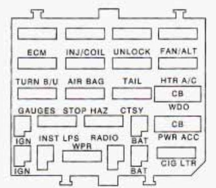 | INST LPS | Illumination for: I/P, Radio, Pod Lamps, Ashtray, Console Lamp, Heater and A/C Control, Defog Switch, Headlamp Switch, Power Antenna |