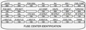 | IGN 1 | 10 | TRUNWFUEL DOOR RELEASE INHIBIT RELAY “E”, FUEL LEVER SENSOR, ELECTROCHROMIC MIRROR, RAP/ILLUMINATED ENTRY MODULE, THEFT DETERRENT MODULE, KEYLESS ENTRY MODULE, TURN FLASHER RELAY “F TRUNK COMP MICRO RELAY CENTER |