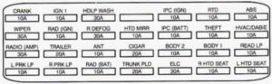 | BODY 2 | 10 | POWER MIRROR SWITCH, RAP RELAY, LOCK-OUT INHIBIT RELAY “A” (TRUNK COMP 1 MICRO RELAY CENTER), COURTESY LIGHTS RELAY “C” (TRUNK COME 2 MICRO RELAY CENTER), RAP RELAY “E (TRUNK COMP. 2 MICRO RELAY CENTER), KEYLESS ENTRY MODULE, TRUNK LAMP |