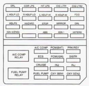 | IGN 1* | Front and Rear Ignition- 1 Relay, Oxygen Sensor 1 and 2 Fuse, Fuel Fuse, Cruise Fuse, DRL Relay, Front and Rear Fog Lamp Relay, Control Power Back-up Relay, Ignition- 1 Fuse |