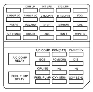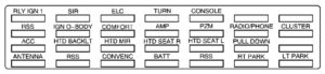 | IGN 1 | Front Ignition-1 Relay, Oxygen Sensor 1 and 2 Fuse, Fuel Fuse, Cruise Fuse, Fuel Pump Relay |