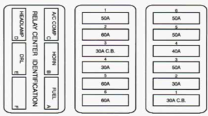 | FUSE 6 | LAMPS | 50 | TURN FLASHER MODULE, HAZARD FLASHER, STOP/BTS/CIRCUISE BRAKE SWITCH, PARKING LIGHTS, DAY TIME RUNNING LIGHTS (CANADA), ENGINE COMP. FUSES B1, B3 AND B5, TRUNK COMP. FUSES D11, D13 |