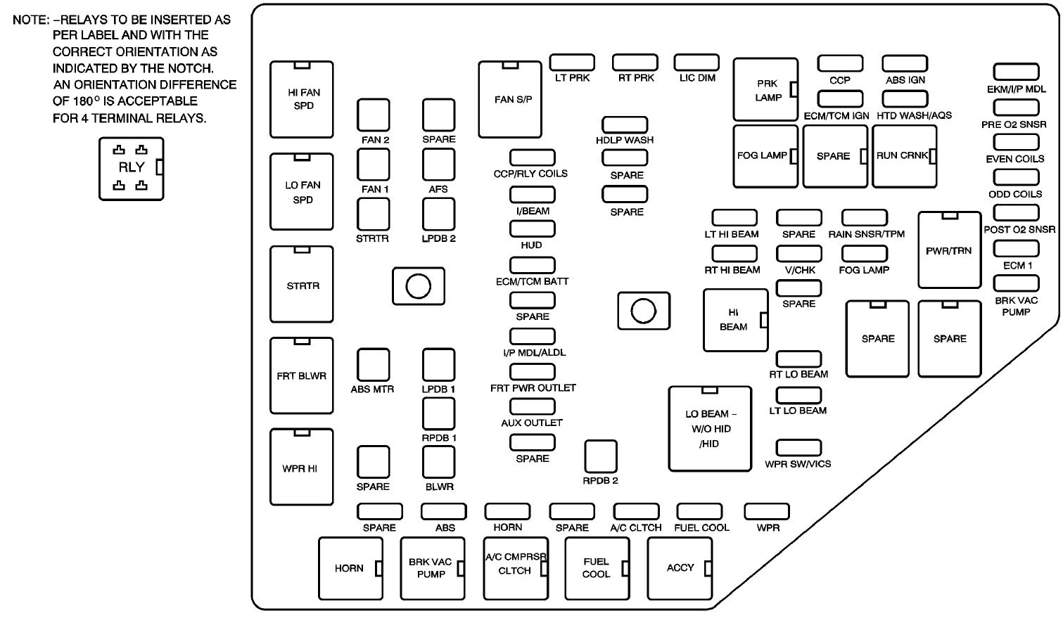 | CCP/RLY COILS | Climate Control Panel, Headlamp Level Control, Active Cruise Control, Relay Coils, Starter, Front Blower |