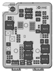 The engine compartment fuse block is located on the driver side of the vehicle, near the battery.