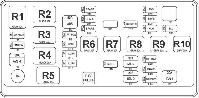 | Ef17 | 10 | Head Lamp LOW, ECM, Rear Fog Lamp Relay, DRL Module, Head Lamp Leveling Switch |