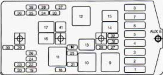 | 7 | BATT MAIN 1 | Fuses (UP): ABS MDL BATT, CIGARDLC, CTSY LAMP, FRT PWR SCKT, PWR LOCK, PWR MIRROR and RR PWR SCKT |