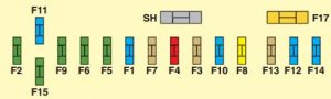 F14 15 Rain and brightness sensor – Parking assistance – Passenger’s electric seat – Trailer relay unit – HIFI amplifi er ECU – Handsfree kit – Lane Departure Warning System