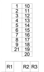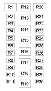 | 3 | 125 | D+ Relay No.1 (Fuse Box No,2: “9”, “10”, “11”), Fuse Box No,2: “1”, “2”, “3”, “4”, “5”, “6”, “12”, “13”, “14”; Fuse Box No,3: “1”, “3”, “4”, “5”, “6”, “8”, “9”, “11”, “18”, Fuse Box No.4: “1”, “5”, “6”, “7”, “8”, “9”, “10” |