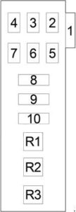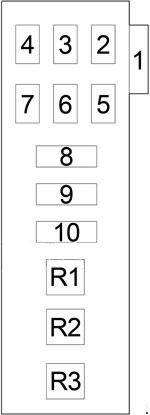 | 1 | 10 | Daytime Running Lamp Relay (Instrument Cluster, Headlamp Left, Headlamp Right, License Plate Lamp, Marker Lamp) |