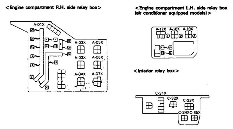 Air conditioner contlol unit, air conditioner switch blower, defogger timer, heater relay, power window relay, transistor relay*1, daytime running light relay 2*1, ABS relay