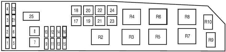 | 5 | 2 | Powertrain Control Module (PCM relay), Fuel pump relay, Main fan relay, High/Low speed fan relay 2, PATS module |