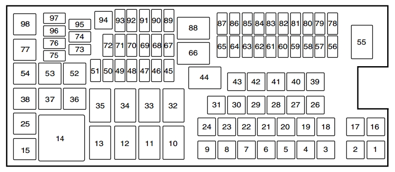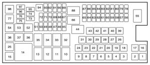 | 70 | 15* | Vehicle power #3 (coil) – A/C clutch relay, Fan control relays, Variable air conditioning compressor, Auxiliary transmission warmup, Turbo charge waste-gate control, Electronic compressor bypass valve (for turbo charger), All-wheel drive module, Positive crackcase ventilation heater |