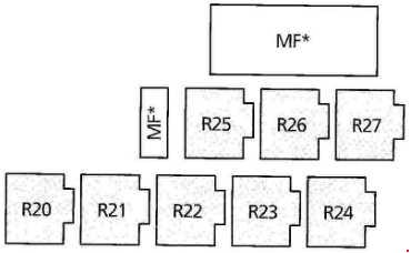 | 29 | 5 | Front wiper, heated washer jets, blower relay, Air conditioning, central junction box, auxiliary heating, heated front and rear screen, heated washer jets |