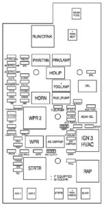| RUN/CRNK | Run/Crank, Airbag System Fuse, Cruise Control Fuse, Ignition Fuse, Back-Up Lamps, ABS Fuse, Front Axle, PCM-1, Injectors Fuse, Transmission Fuse, ERLS |