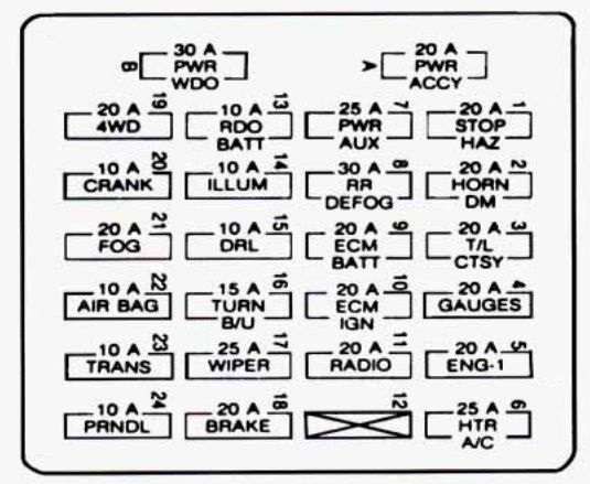 GAUGES 20 Alternator Field, VTC, A/C Compressor Relay, Cluster Chime Module, DRL Relay Coil, Four-wheel Drive Indictor Lamp, DRL Module, Rear Defog Timer, TCCM Ignition, SIR Redundant Ignition, RKE Ignition