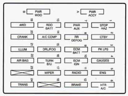 | 4 | Alternator Field, A/C Compressor Relay, Cluster Chime Module, DRL Relay Coil, Four-Wheel-Drive Indicator Lamp, DRL Module, Rear Defog Timer, Transfer Case Control Module Ignition, SIR Redundant Ignition, RKE Ignition |