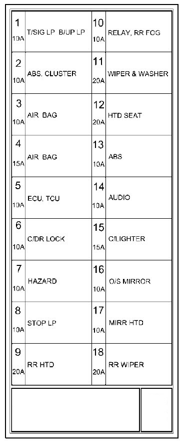 | TAIL LH | 10 | Illumination lamps, Left rear combination lamp, License lamp, DRL control, Position lamp, H/LP washer relay | |