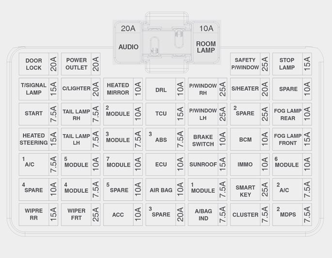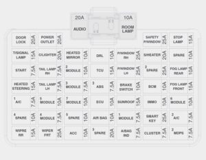 I/P Junction Block(Room Lamp Relay), Overhead Console Lamp , A/C Control Module, SLM, BCM, Auto Light & Photo Sensor, TPMS Unit ,Instrument Cluster, Data Link Connector, Room Lamp, Trunk Room Lamp, Electro Chromic Mirror |