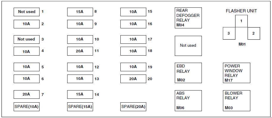 | 16 | 10 | Instrument cluster, ABS relay, EBD relay |