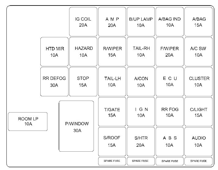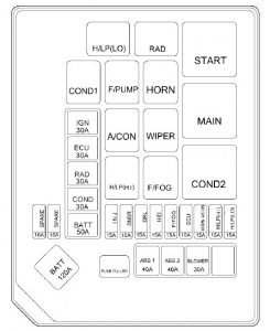 | ECU | 30 | Engine control relay, Fuel pump relay, A/T control relay, Generator, ECM (1.6L/2.7L), PCM(2.0L) |
