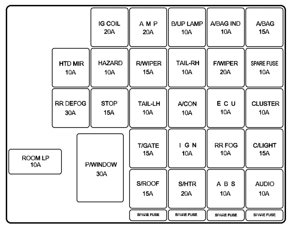 | ECU | 30 | Engine control relay, Fuel pump relay, A/T control relay, Generator, ECM (1.6L/2.7L), PCM(2.0L) |