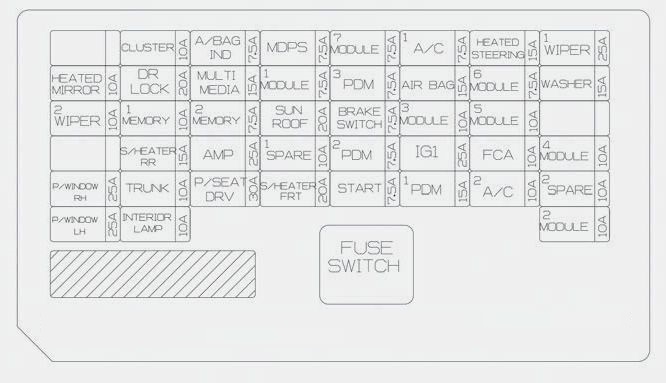 Crash Pad Switch, Electro Chromic Mirror, A/T Shift Lever Indicator, A/V & Navigation Head Unit, Audio, A/C Control Module, Console Switch LH/RH, Head Lamp Leveling Device LH/RH, Front Seat Warmer Control Module, Rear Seat Warmer Control Module, Driver IMS Module |