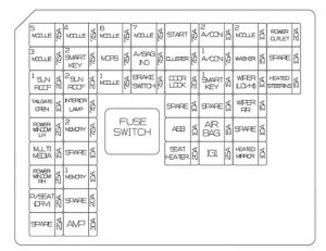 | MODULE 5 | 7.5A | Crash Pad Switch, Electro Chromic Mirror, A/V & Navigation Head Unit, A/C Control Module, A/T Shift Lever Indicator, Console Switch LH, Head Lamp Leveling Device LH/RH, Front Seat Warmer Control Module, Front Air Ventilation Seat Control Module |