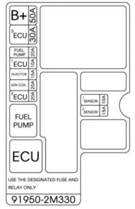 | SENSOR 1 (G4KF) | 10A | Cooling Fan (High)/(Low) Relay, Oxygen Sensor (Up)/(Down) |