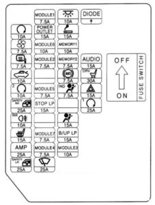 | MODULE1 | 7.5A | AMP, Audio, A/V & Navigation Head Unit, Multi Monitor, MTS Module Front Monitor, Map Lamp, Power Outside Mirror Switch |