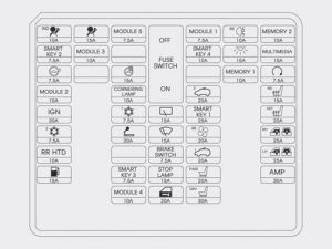 Warmer Module, Driver IMS Module, Console Switch LH/RH, Rear Console Switch, Rear Parking Assist Sensor (Center) LH/RH, Driver/Passenger Door Module, Electric Parking Brake Module