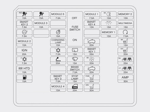BCM, Instrument Cluster, Tire Pressure Monitoring Module, AMP, Smart Parking Assist Control Module, Electro Chromic Mirror, Lane Departure Warning Module, Steering Angle Sensor, Audio, A/C Control Module, A/V & Navigation Head Unit, 4WD ECM ATM Shift Lever Indicator, Rear Parking Assist Sensor LH/RH, Rear Seat Warmer LH/RH, Driver/Passenger Climate Control Seat Control Module, Driver/Passenger Seat