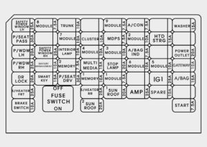| 2MODULE | 10 | Audio, A/V & Navigation Head Unit, TMU Unit, Digital Clock, BCM, AMP, Power Outside Mirror Switch, Digital Clock, Smart Key Control Module, Overhead Console Lamp |