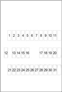 | B | 80 | Accessory Relay (Fuse: “22”, “23”), Ignition Relay (Fuse: “9”, “9”, “10”, “11”), Blower Motor Relay (Fuse: “16”), Fuse: “12”, “13” |