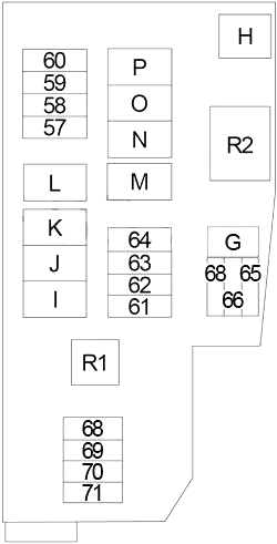 | F | 100 | Accessory Relay No.1 (Fuse: “19”, “20”, “21”), Rear Window Defogger Relay (Fuse: “22”, “23”, “24”), Blower Motor Relay (Fuse: “17”, “27”), Fuse: “1”, “2”, “3”, “4”, “9”, “10”, “11”, “12”, “13”, “14”, “15”, “16”, “25”, “65”, “66”, “67”, “G” |