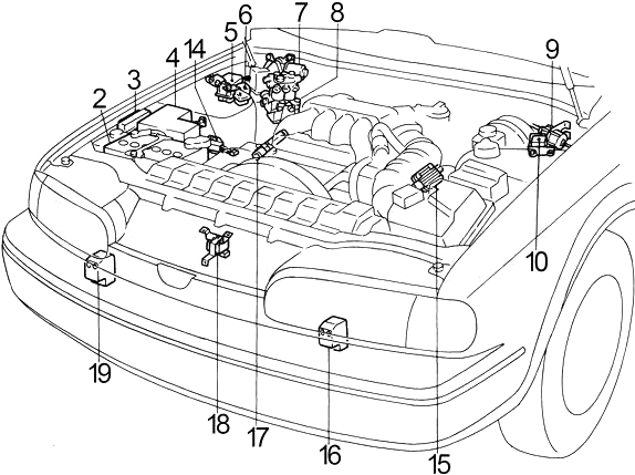 | 15 | ’90-’93: Stop Lamp Switch, Stop and Tail Lamp Sensor, Diagnostic Information Display Control Unit, Automatic Speed Control Device (ASCD) Control Unit, Active Suspension, Power Steering System, High Capacity Actively Controlled Steering (HICAS) Control Unit | |