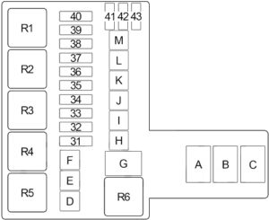 | G | 75 | Accessory Relay No.1 (Fuse: “10”, “11”, “12”, “29”), Ignition Relay No.1 (Fuse: “13”, “16”, “24”, “25”, “26”), Ignition Relay No.2 (Fuse: “1”, “2”, “28”), Fuse: “E”, “F”, “J”, “17”, “18”, “19”, “20”, “21”, “22”, “41”, “42”, “43” |
