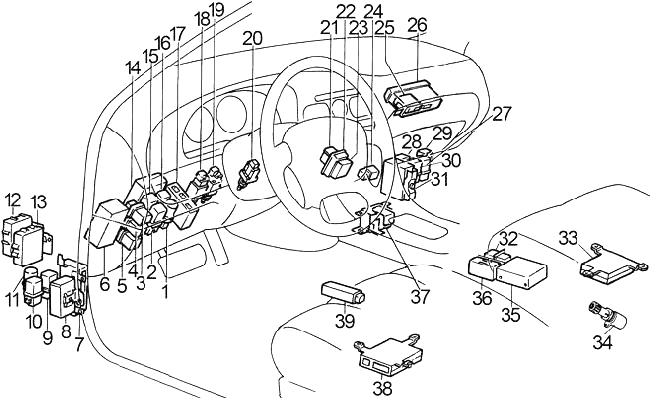 | 10 | ’90-’93: Hazard Switch (Combination Flasher Unit), Multi-Remote Control Relay, Multi-Remote Control Check Relay, Turn Signal Switch, Turn Indicator, Multi-Remote Control Unit | |