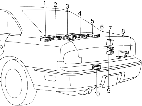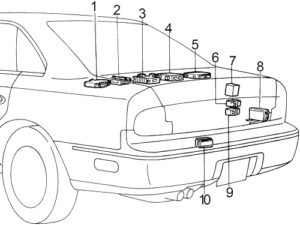 | 37 | 10 | ’94-’96: Clearance Lamps, Side Marker Lamps, Tail Lamps, License Plate Lamps, Stop and Tail Lamp Sensor, Headlamp Relay Unit, Lighting Switch, Glove Box Lamp, Body Control Module (BCM), Warning Chime, Illumination Control Switch, Illumination: (Combination Meter, Ashtray, Automatic Speed Control Device (ASCD) Main Switch, Rear Window Defogger Switch, Cigarette Lighter, TCS Switch, Power Window Main Switch, 1ST Position Switch, Air Conditioner Switch Panel, Hazard Switch, Clock, Door Mirror Switch, Radio, Heated Seat Switch, Auto Anti-Dazzling Inside Mirror, Power Window Switch) |