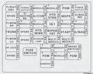 | MODULE 2 | 10 | Electro Chromic Mirror, Multipurpose Check Connector, A/C Control Module, Driver CCS Switch, Driver/Passenger Air Ventilation Seat Control Module, Driver/Passenger Seat Warmer Module, Driver IMS Module, A/V & Navigation Head Unit, ATM Lever Indicator, Rear Seat Warmer LH/RH, Rear Power Window Switch LH/RH, Rear Seat Warmer LH/RH, Audio, Dynamic Bending Light Module, Console Switch LH/RH |