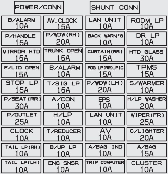 | P/SEAT (RR) | 30 | Power seat (rear) |