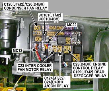 | ENG | 15 (D4BH) 10 (J2/JT) | Injection Pump, ECM, Condenser Fan Relay, Neutral Switch, Vehicle Speed Sensor, EGR Solenoid Valve, Glow Control Unit, Fuel Filter Warning Switch, Oil Filter, Generator, Inter Cooler Fan Relay |