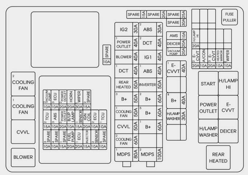 | SENSORS 2 | 10 | E/R Junction Block (Fuel Pump Relay, Cooling Fan 1/2 Relay) [G4KJ] Oil Control Valve (Exhaust), Purge Control Solenoid Valve, Variable Intake Solenoid Valve, CanisterClose Valve [G4KH] Oil Control Valve (Exhaust), Purge Control Solenoid Valve, RCV Control Solenoid Valve, Canister Close Valve [G4FJ] Oil Control Valve #1/#2, Purge Control Solenoid Valve, RCV Control Solenoid Valve, Canister Close Valve |