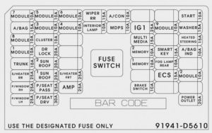 | FUSE | B+4 | 40 | Smart Junction Block (Leak Current Autocut Device Fuse – INTERIOR LAMP, MEMORY1, MULTI MEDIA, Fuse – DOOR LOCK, MODULE1, SMART KEY, BRAKE SWITCH) |